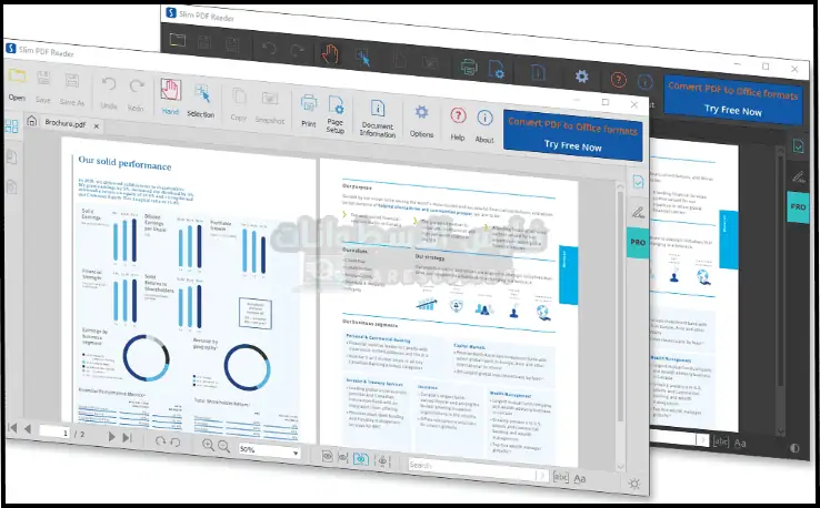 وقد احتل برنامج PDF لأجهزة الكمبيوتر المرتبة الأولى عالميًا في قراءة مختلف المحتويات الإلكترونية والرقمية. ويحظى برنامج تنزيل قارئ PDF لأجهزة الكمبيوتر بشعبية كبيرة لأنه يتضمن واجهة سهلة الاستخدام، مع تحكم كامل في تعديل حجم الخط وسهولة الوصول إلى الصفحة المطلوبة أو البحث عن الكلمات داخل الملفات الكبيرة. كل هذا متاح مجانًا. ومع ذلك، تنزيل برنامج PDF للكمبيوتر تم إصدار إضافات أخرى يمكنك تجربتها مجانًا لمدة شهر، وبعد ذلك يجب عليك الاشتراك في النسخة المدفوعة.