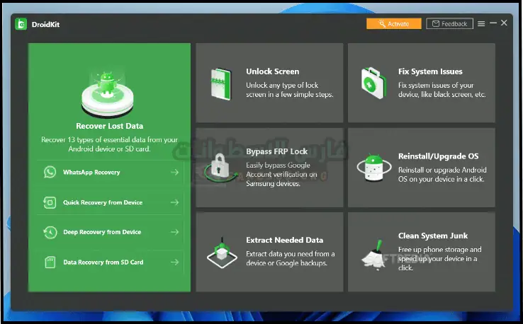تحميل برنامج DroidKit كامل مع الكراك هو برنامج قوي ومتعدد الاستخدامات يمكن أن يكون مفيدًا لأي شخص يواجه مشكلات في جهاز Android الخاص به. سواء كنت بحاجة إلى استعادة البيانات المفقودة أو إلغاء قفل جهازك أو إصلاح مشكلات النظام، فإن DroidKit يوفر مجموعة شاملة من الأدوات لمساعدتك. تحميل برنامج DroidKit كامل مع الكراك هو برنامج شامل لإصلاح مشاكل الأندرويد و يوفر مجموعة متنوعة من الأدوات التي يمكن استخدامها لحل مجموعة واسعة من المشكلات ، بما في ذلك فتح قفل الشاشة وتجاوز FRP واستعادة البيانات وإصلاح النظام.